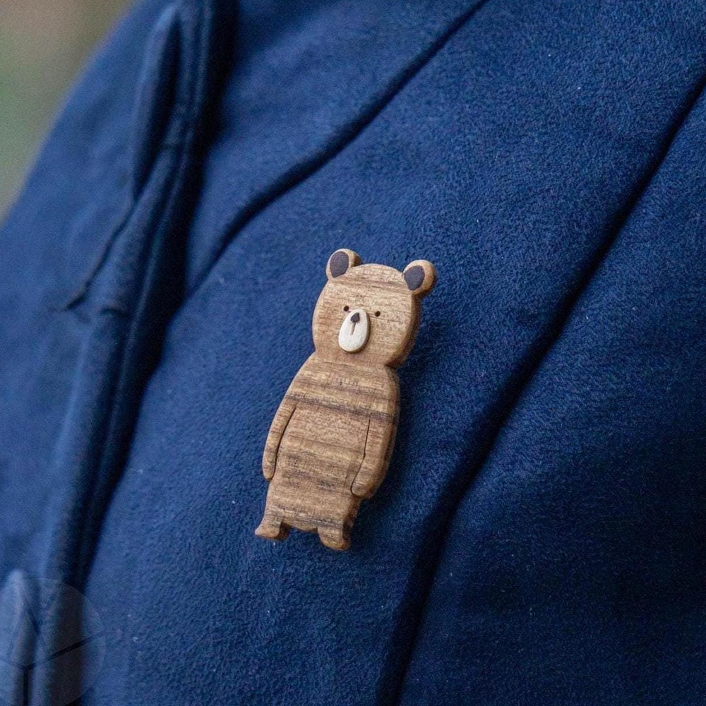 Little bear Pin Badge Brooch – Handmade and hand carved wooden pins – cute funny animal characters for clothes, jeans and bags