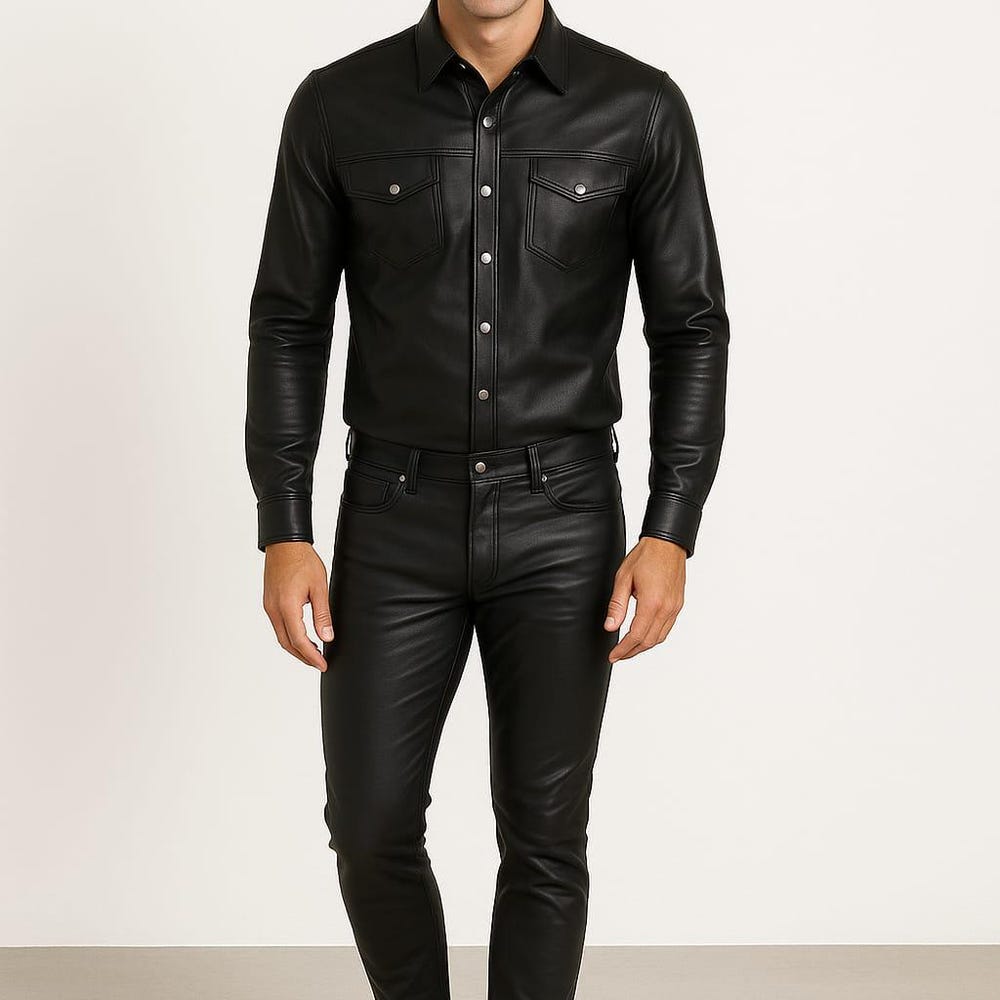 Men’s Real Leather Shirt & Pants Set – Handmade Black Snap Button Shirt with Matching Slim Fit Trousers – Western Outfit – Office Outfit