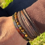 Men’s Natural Stone Beaded Bracelet, Set of 3 Bracelets with Gemstone Hematite Beaded Bracelet, Tiger Eye Bracelet, Leather Bracelet 20.50cm |